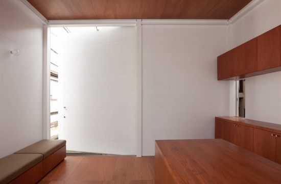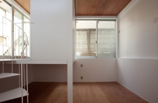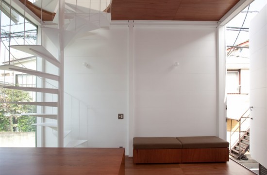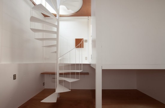 左側にみえるのがさきほどの玄関です。その手前にはさきほど外からみえた螺旋階段があります。いきなり地下へと続いているため、狭い住宅ではありますが、開放感を感じさせます。