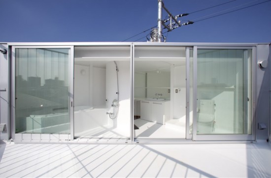 そしてここが屋上です。屋上にバスルームがあります。左がシャワールームで、右がトイレとなっております。右から2番目の扉の奥にちらっとみえるのが先ほどの螺旋階段です。