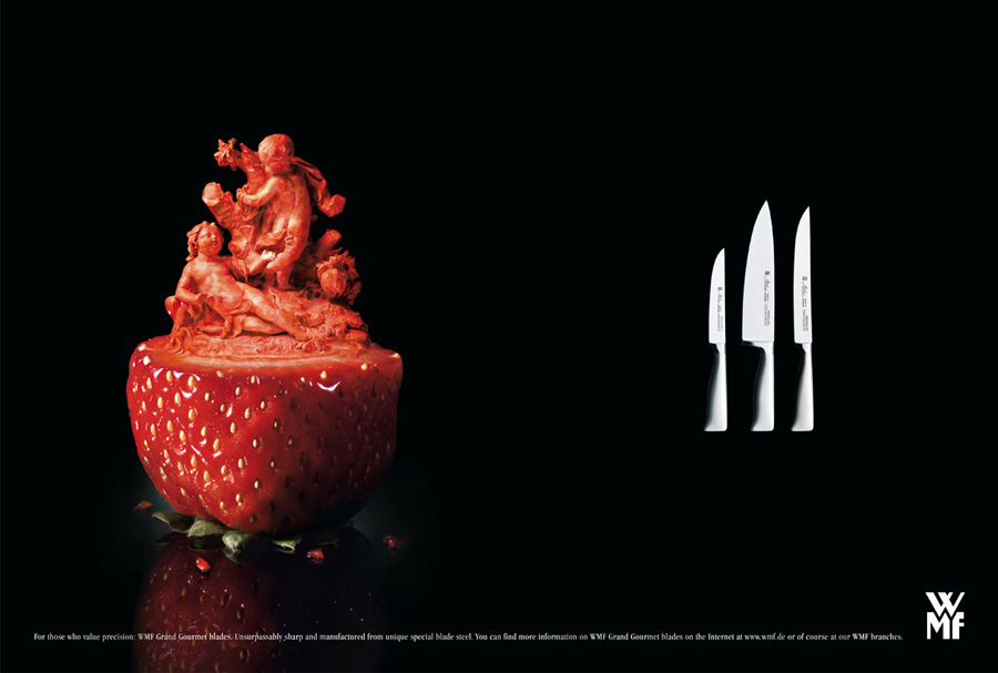 そんな数多くある広告の中で今回ご紹介するのは、一粒のイチゴの上に彫刻をほどこし、繊細かつ高度な使い勝手を表現したドイツ老舗食器メーカーWMFの広告です。