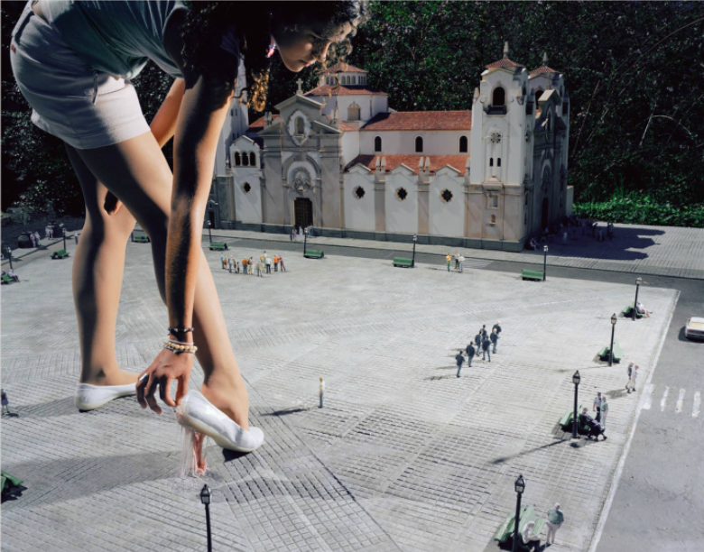 街中の広場でハイヒールを履いています。こちらの進撃の巨人は何かをつまんでいるようですね。