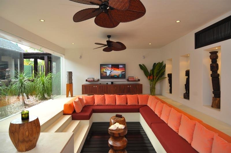 リビングの天井から吊り下げられたシーリングファンがおしゃれです。ソファーの色使いも赤とオレンジとホワイトの三色に絞ることにより、何故か印象に残る部屋になっています。