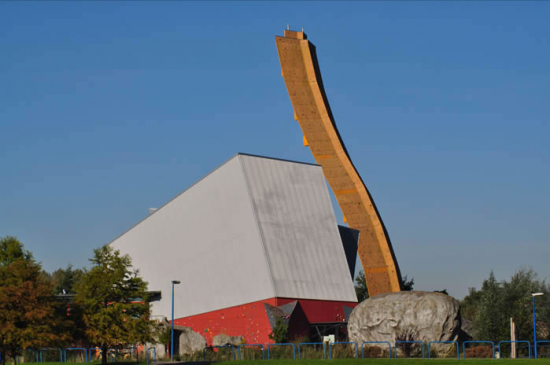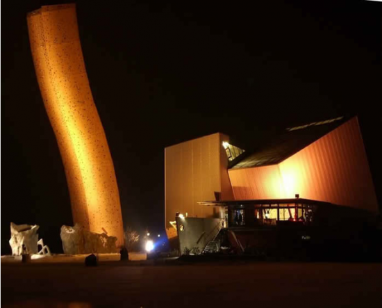 世界一の高さのクライミング施設エクスカリバータワーを横からみると、随分とうねりがある建物であるのかがわかります。