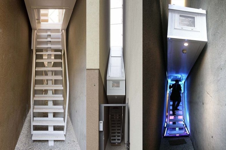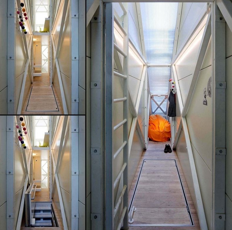世界一の狭小住宅Keret Houseの家の中の様子です。左下に見える写真が階段となっており、むやみに人が入ってこれないように扉をたたむことが出来るようになっています。