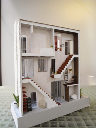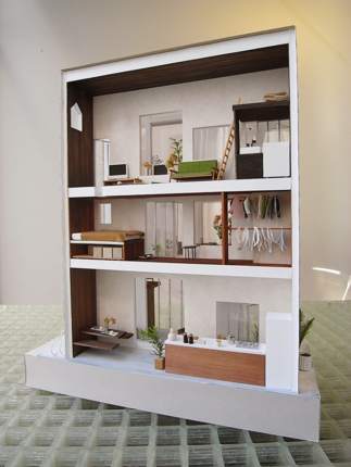次に入り口を正面にして右側にある、主に実際に部屋として使用する棟です。わずか9坪の土地にどのように配置しているのかがわかる配置図や平面図、断面図の模型ですが、この模型をみるだけでもどんな住宅なのかワクワクしますね。