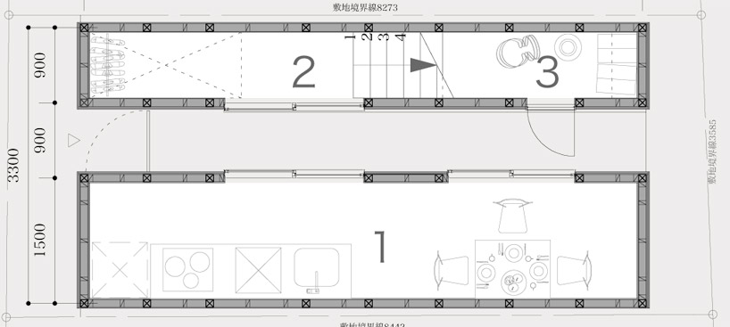 わずか9坪の土地に建てられた狭小住宅の配置図と断面図