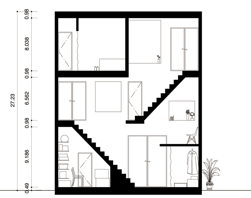 9坪の土地に建てられた狭小住宅の断面図