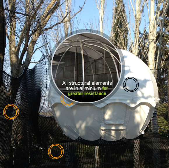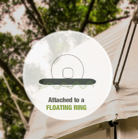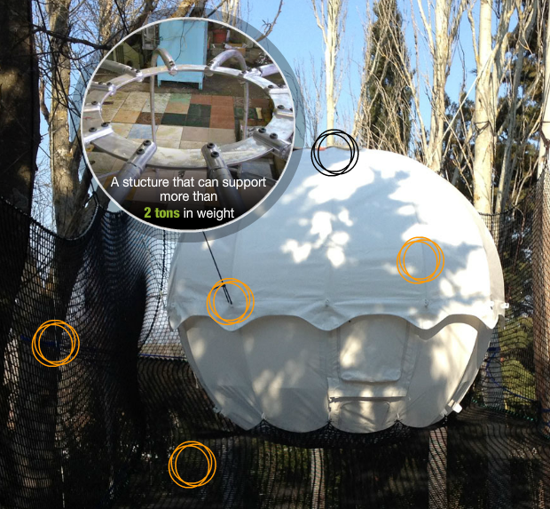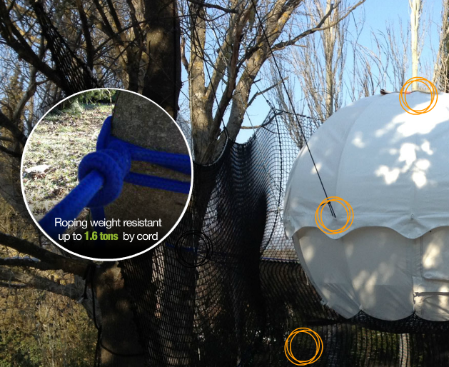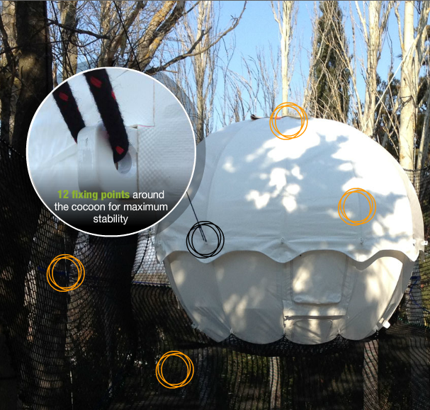 画像をご覧頂ければわかりますが、COCOON TREE(コクーンツリー)は、ポータレッジ(portaledges)とは違い、周辺の様々な木々を利用することにより球体の重心を支え合う構造をしています。宙に浮かぶテントではありますが、支点が複数あるため、安定性は非常に高くなっています。