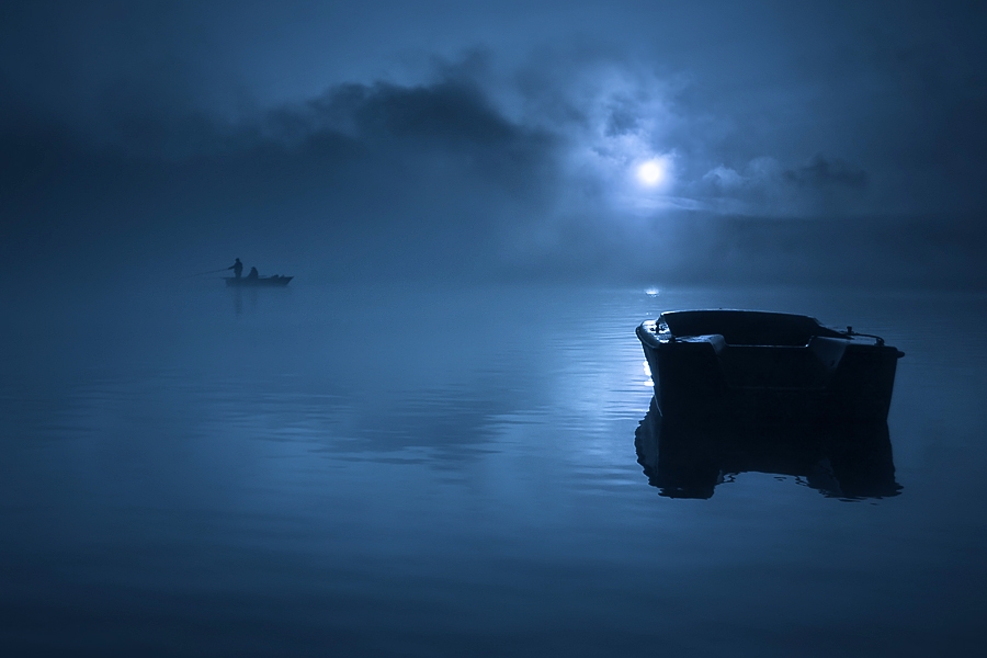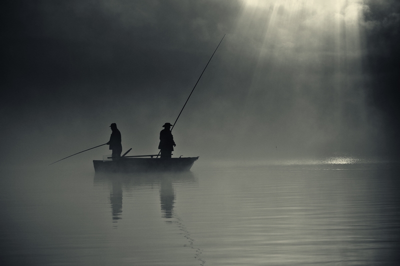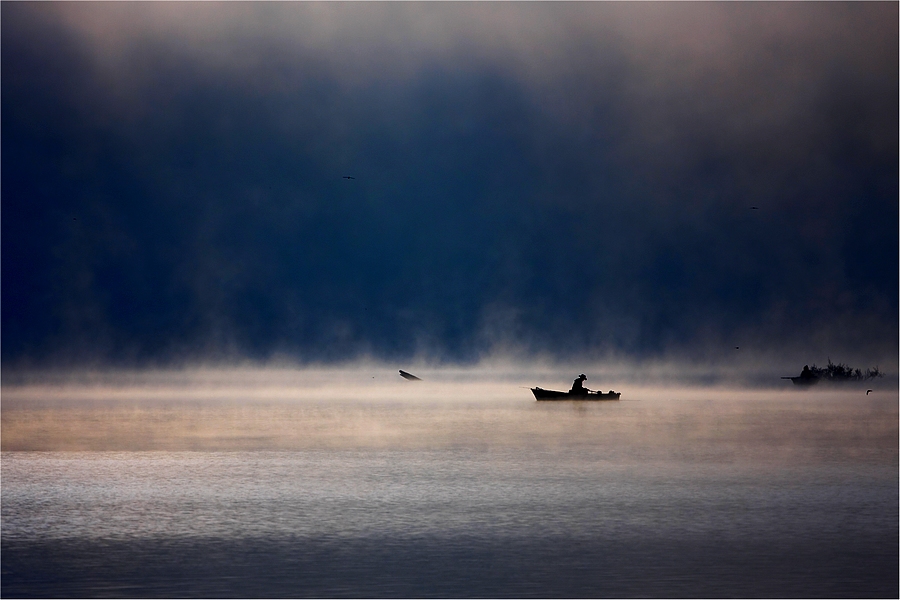 池の上にもやが立ちこめています。人がボートをこいでいます。