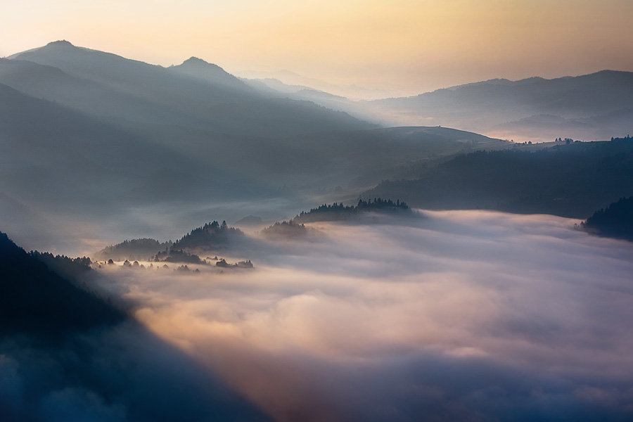 もやが谷間に立ちこめ、陽によってぼうっと照らされています。陽によって自然が目覚めているかのような風景写真です。