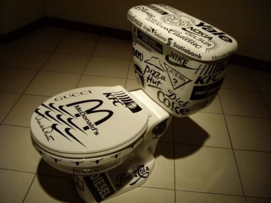 マクドナルドやら、ナイキやらケンタッキーフライドチキンやらディーゼルやらピザハットやら・・・統一性もなく、何がなんだかわからないロゴだらけの便座です。