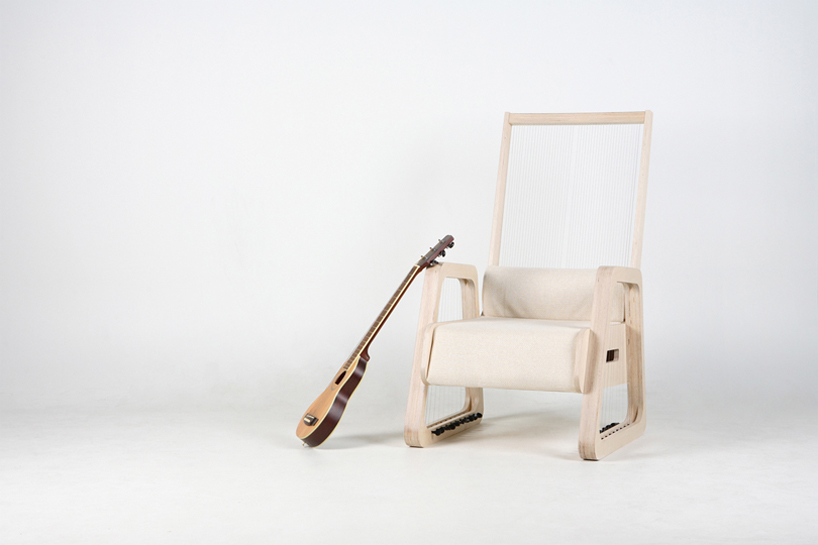 全体的に薄い色で統一されています。1日の疲れを癒す為にちょっとリラックスしたい時、この椅子にもたれかかりながらアームレストの弦で音楽を奏でても良いかもしれません。
