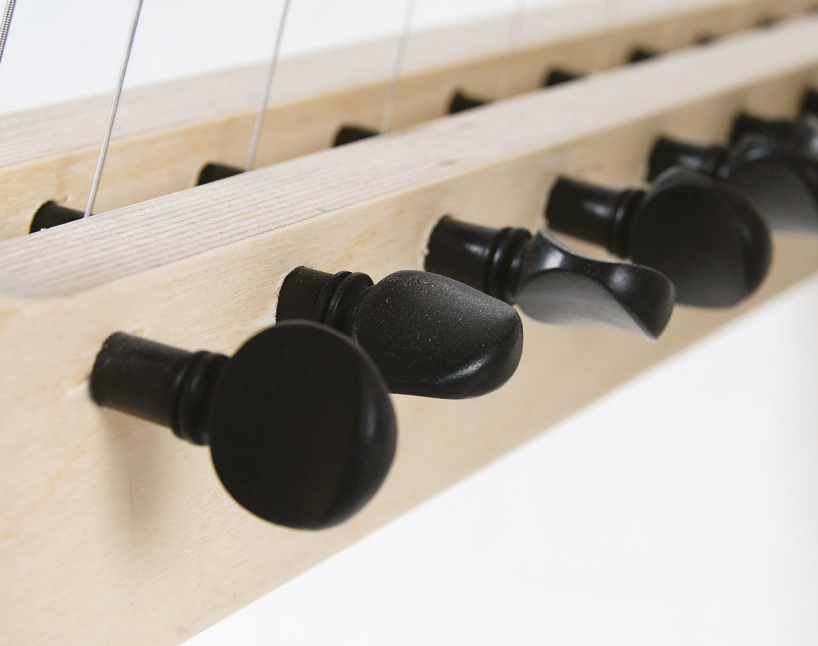 弦は左右についており、ハープのように弦をひくことで音楽を奏でることができます。椅子に座りながら、自分の好きな曲を、そっとひく。なんて素敵な時間を過ごすことが出来るのでしょうか。
