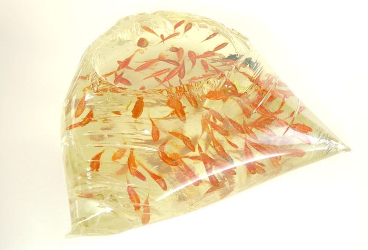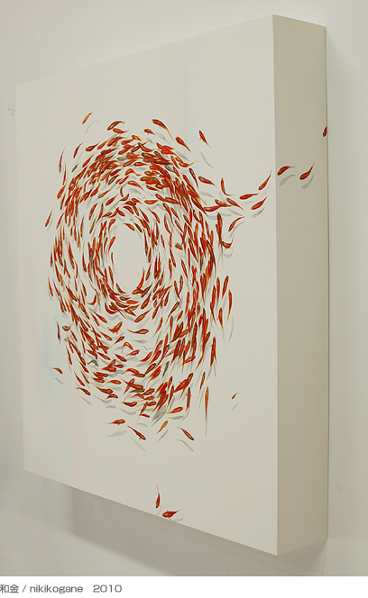 深堀さんは、高透明なエボキシ樹脂とアクリル絵の具を使い幾層にも色を重ねあわせることで平面の金魚が立体的にみえる絵をつくることで有名ですが、それだけではなく、金魚という題材をもとにして、様々な作品をつくりあげています。