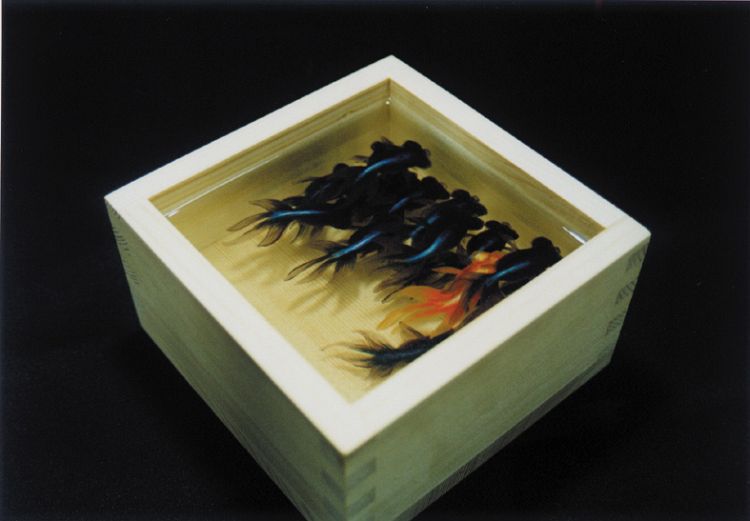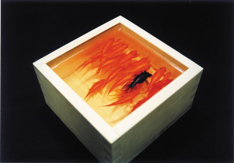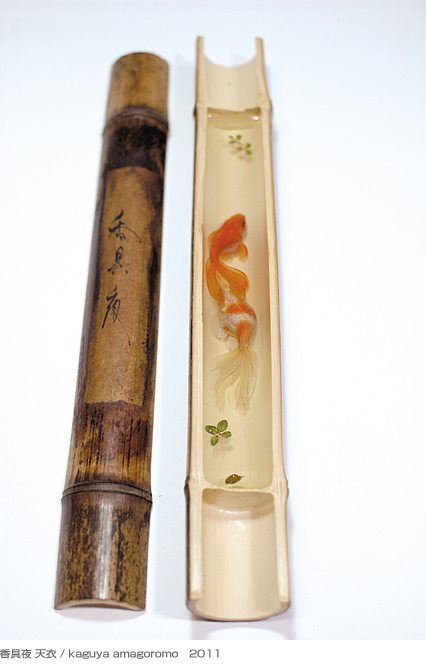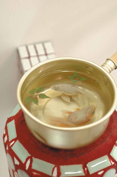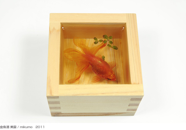 そんな深堀さんの金魚絵師としての作品の中でも工業用の高透明なエボキシ樹脂を使い升や桶、または半分に分かれた竹の凹みの部分に金魚が描かれているいく作品は特に印象的で、深い味わいを感じさせ、また多くのひとに知れ渡っています。
