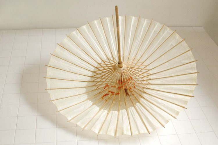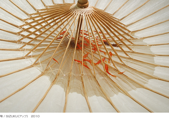 こちらは「雫」という作品で、傘の中央の水たまりに金魚が泳いでいるという美しい金魚絵です。