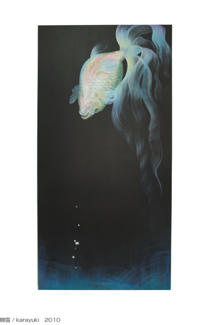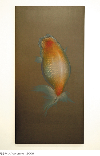 そんな時にたまたま部屋に飼っていた金魚を上から見た時に、その美しさに惚れ、以来金魚絵師として活動するようになったようです。