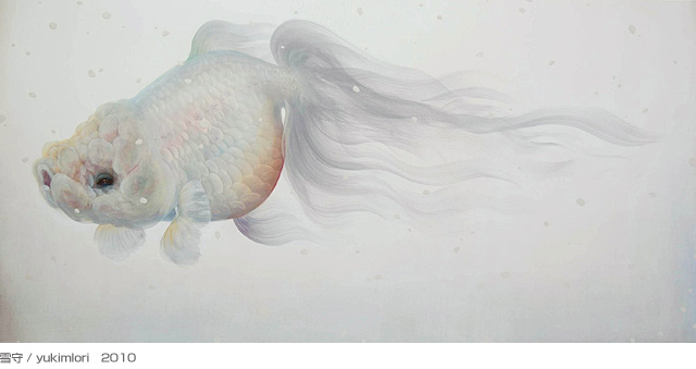 深堀さんは複数の金魚を飼っているようですが、実在する金魚を模写しているわけではなく自分の感性に従って金魚を描いているようで、厳密にみれば現実にはあえりえない品種が描かれていたりするようです。