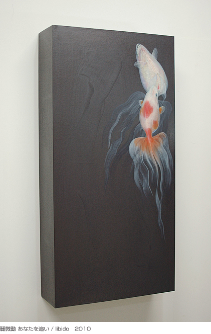 もちろん、平面に描かれた金魚の絵を幾層にも重ね合わせるという作品の性質上、横から見ると、その作品を失ってしまいます。が、その上からしかみることのできない金魚の絵は、金魚の儚さと妖しさという、その魅力を何倍にも引き上げています。