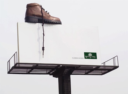 ビルボードの上に靴が・・・紐がたれている面白い広告です。