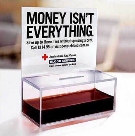 お金がすべてではない。と書かれた貯金箱の中には血液が・・・。