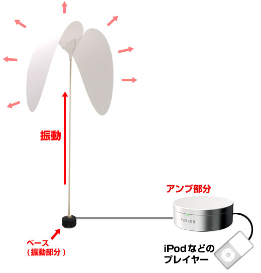 仕組みは単純アンプからの音がベースへ振動として伝わり、ベースに差し込んである棒から紙に振動が伝わり音が出る、という仕組みです。