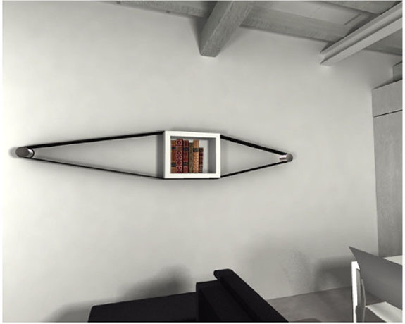 こちらがその完成イメージ図です。壁に杭のようなものを打ち込み、ベルトのようなものの間に本棚が挟まれています。
