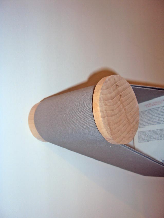 小さな本棚自体をベルトの間に挟んでも使うことができるのはもちろん、直接本を間に挟むこともできるようです。写真では少ない冊数の為、間に間仕切りのようなものが敷いてあります。