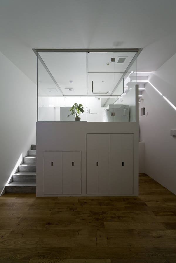 また2階リビングへと続く階段の横にはさきほどのトイレ兼バスルームがみえます。全面がガラス張りのため、天井からのあかりがバスルームにも輝きわたります。