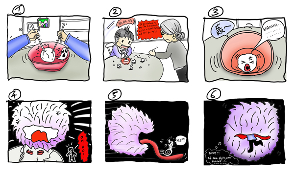 「そうやって食べ物で遊んでいると、こわいこわ〜い毛むくじゃらののモンスターが出てきて坊やを食べちゃうわよ!」