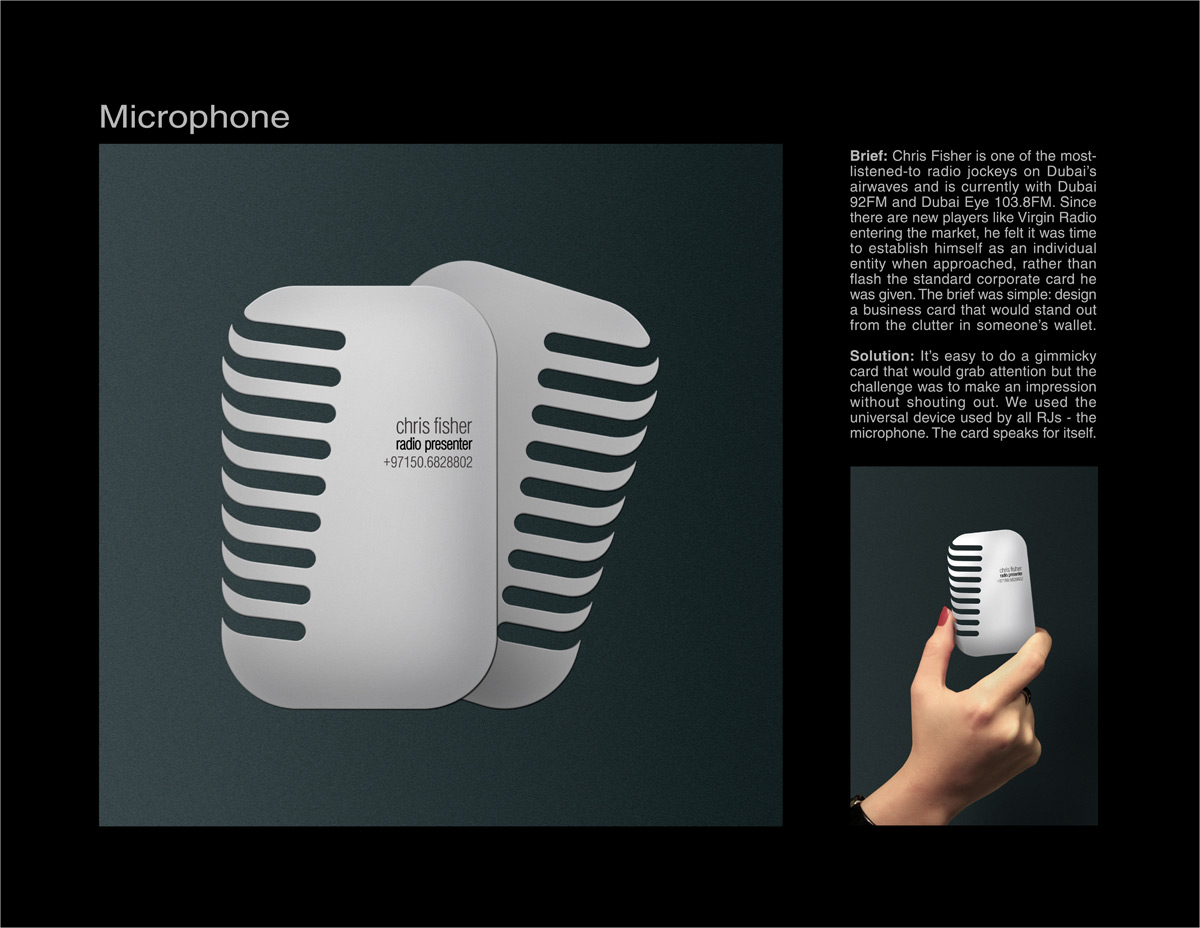 ラジオの司会者らしく、名刺がマイクの形になっています。