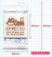 アドガムの寸法や完成イメージです。ガムの大きさは32mm×32mm。大きくもなく小さくもなく適度な大きさです。