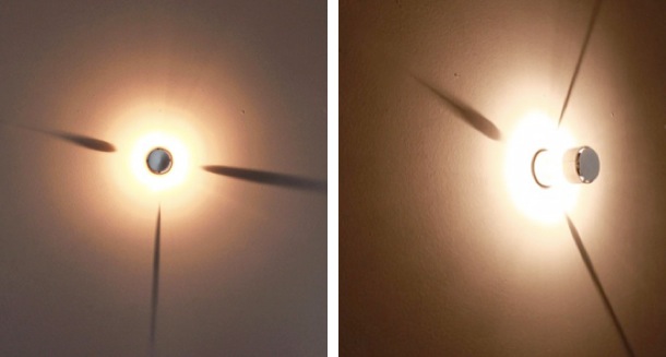 壁に設置された影時計をみると右の写真のように3つの影が針となって四方八方に照らし出します。