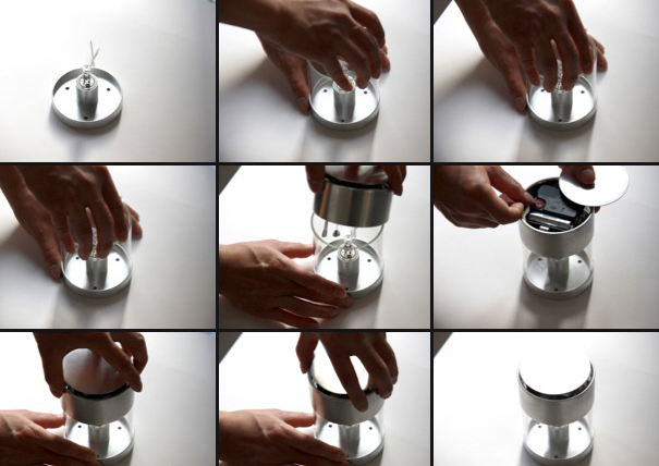 左上の写真から右下の写真まで、ハロゲンランプの設置方法や蓋のかぶせ方、また電池の入れ方などです。