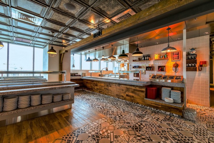 床の模様は花柄と魚、それにチェックなど。モノクロでシックな床となっているようです。カウンター席では外の景色を楽しみながら食事を楽しむことが出来るようです。
