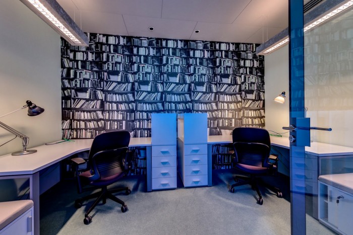 こちらはワークスペース。壁に描かれた本棚が美しい模様をなしています。