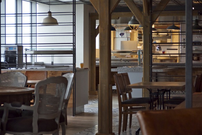 人のいないカフェテリアはこんな風に。奥にみえるのはキッチンです。