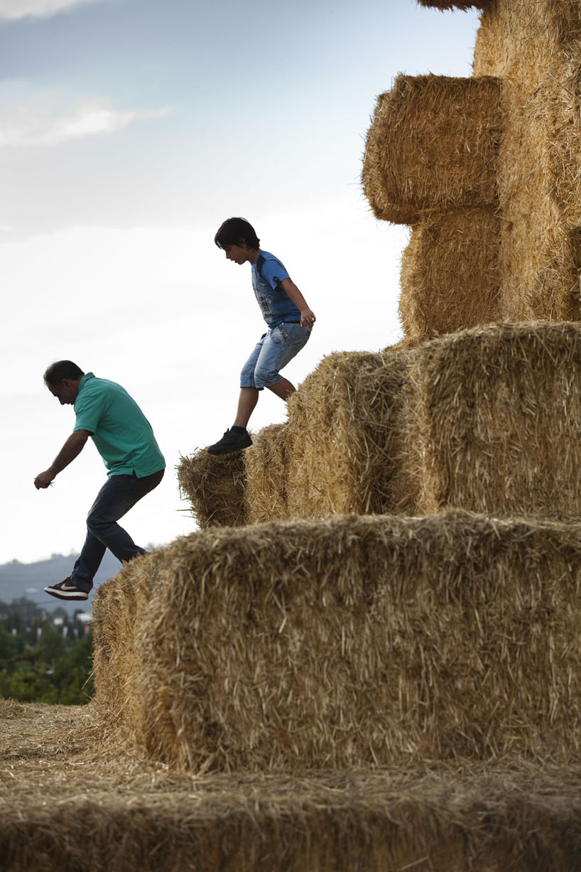 IUT Group( (Nuno Miguel Lima Cruz, Bruno Martins Afonso Gomes, António da Silva Lopes))によって設計されたこのわら俵で出来た人工の建築物Agricultural Mountainは、大きなわら俵(2,80×0,90×0,80m 重量1個当り300kg) を合計288個使い、15層に積み上げられることで出来ています。