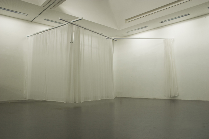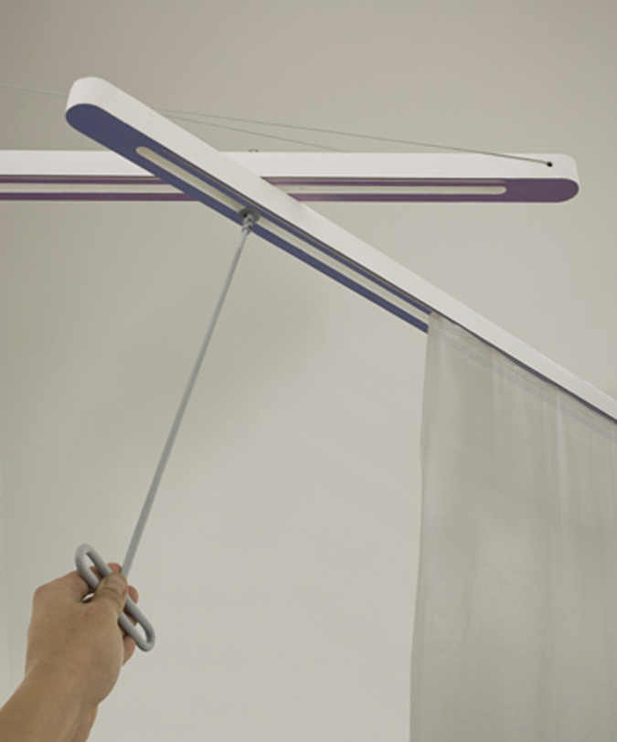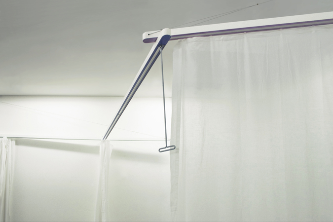 何やらとても不思議な形状をしています。この不思議な形状によって空間をカーテンで自由に仕切ることが出来るようになっています。