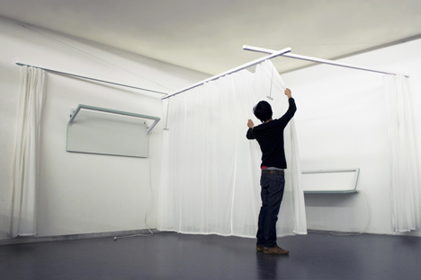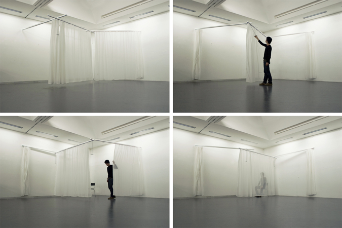 彼が手がけたプロジェクト”リビングツール”。今までに用途にあわせて4変化する多目的パネルと手軽に持ち運びができる間接照明という二つの作品を紹介してきましたが、今回はなんとカーテン。