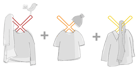 こちらが実用例。「X」の下の部分には従来のハンガーと同様に両肩の部分を引っ掛けるようにして使用します。加えて、「X」の上の部分はフックの役割を備えており、洋服や帽子などを引っ掛けることができるようになっています。