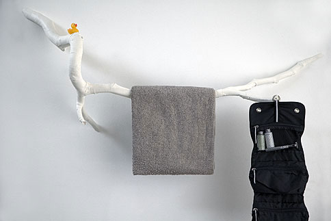 タオルかけとして使用しています。小物入れも枝の先から吊るされています。木の枝の形状が躍動感を解き放っています。