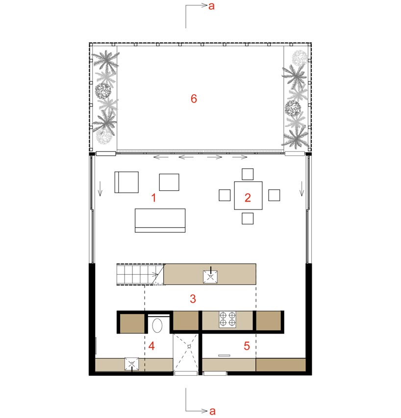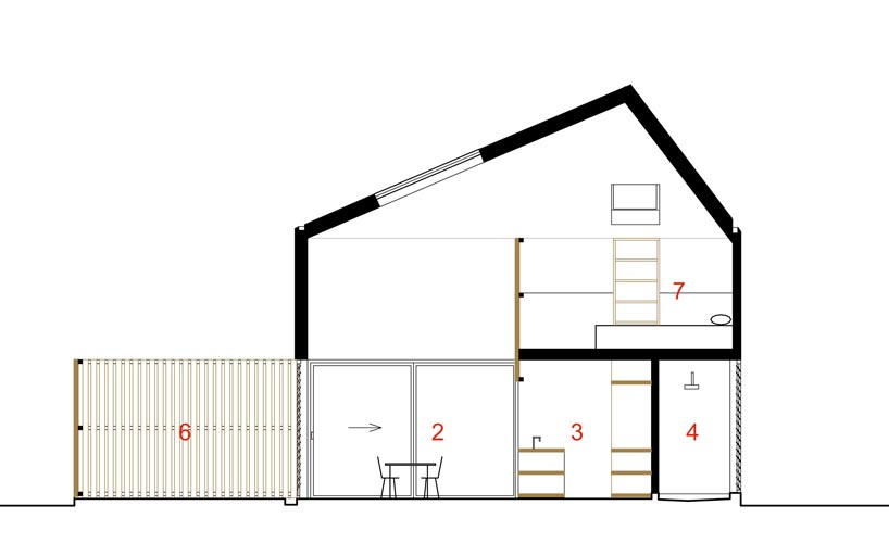 断面図です。二階建てとなっていますが、二階はベッドルームだけのようです。生活に必要なキッチンやリビング、バスルームなどはすべて一階に配置してあるようです。