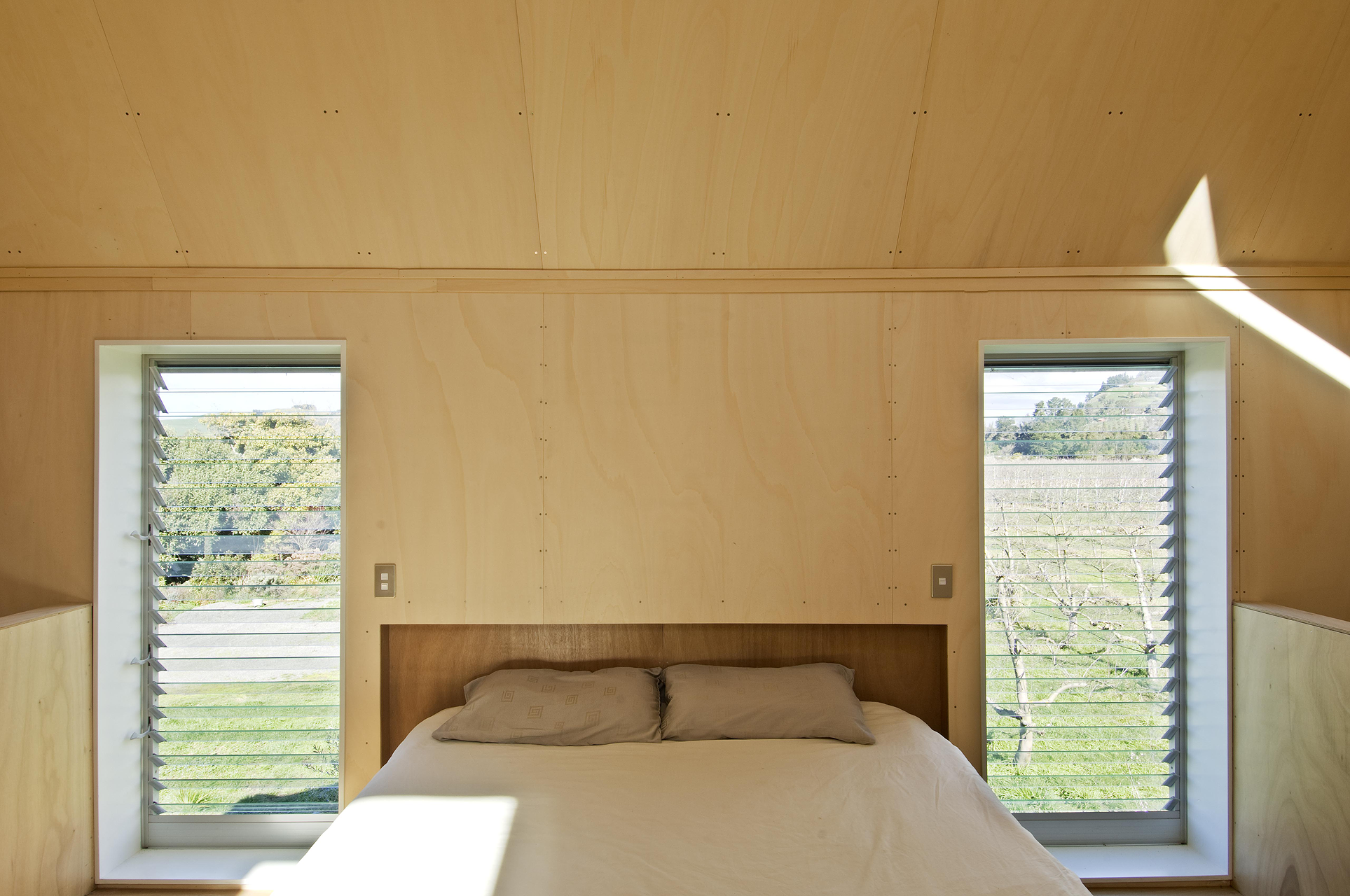 ベッドの横には二つの窓が。あらゆるところに自然光を取り組む工夫がされているため、部屋の中に十分あかりをとりこむことができそうですね。