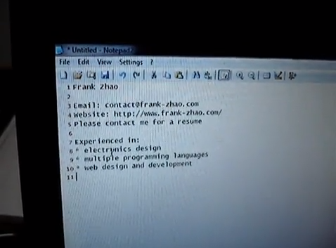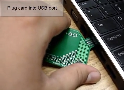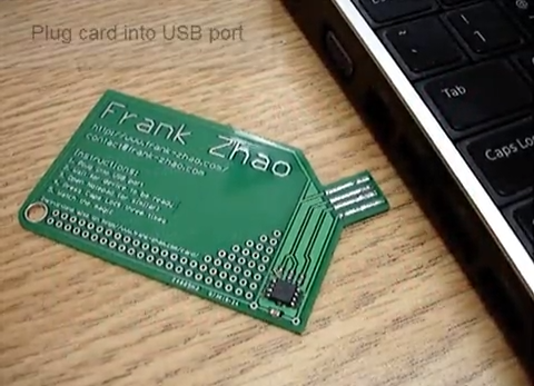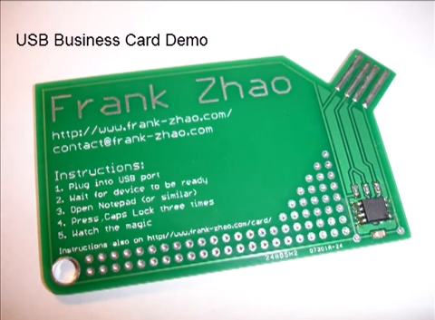 プリント基板の上に名前と連絡先、URLが記載されています。実はこれ、それだけではなく手順に従いUSBとしてパソコンにさすことで情報が出てくるというちょっと変わった名刺となっています。