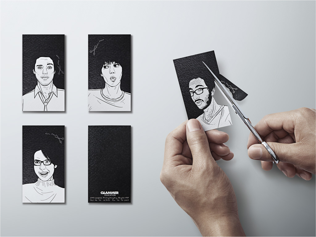 Glammer Education Institute of Hair Designの名刺です。名刺の上部にある黒い部分を自分の好きなようにはさみでカットできるようになっています。裏面の真っ黒い面にはヘアーカットされない部分に連絡先などが記されています。
