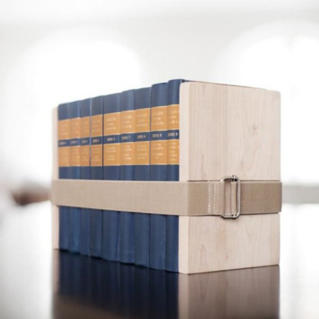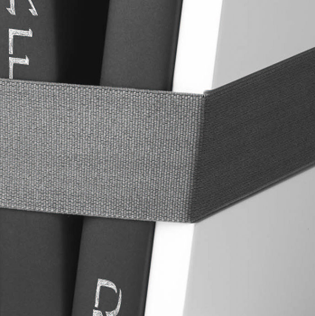 伸縮性のゴムバンドで挟み込む形状だからこそ、一冊だけを持ち上げ、上の写真のようなデザインの本棚にすることも出来ます。おしゃれな本棚だと思いませんか。