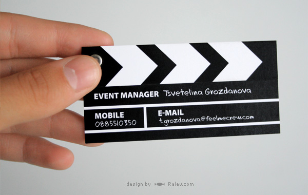 ビデオ撮影や編集などを受持っているFeelme Crewの名刺です。その職業をあらわすかのように、クラックボード(カチンコ)の形をした名刺となっています。