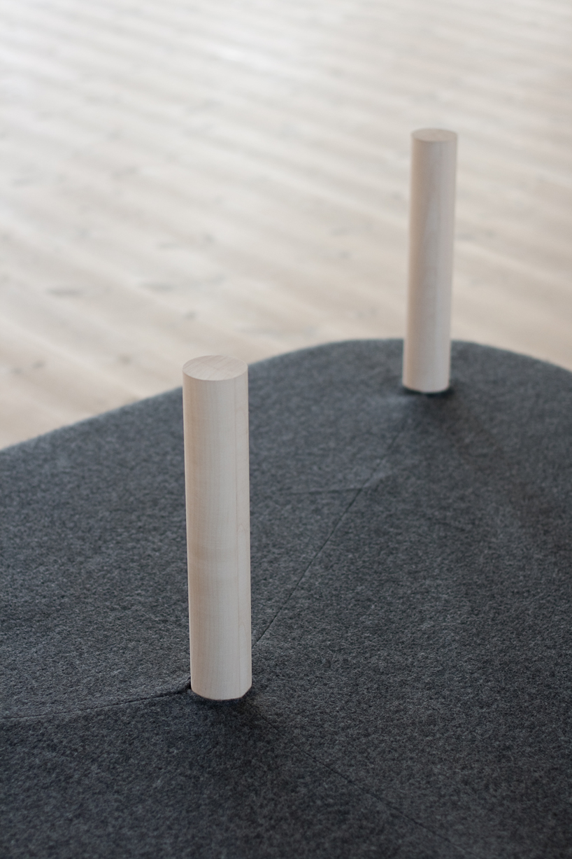 三角形の形状をしたそのソファーは、三角形の頂点3点に釘のように丸いカバ材で出来た支柱(足)がついており、さらに中央にひとつと、合計4つの支柱に沿うようにクッションを置くことによってつくられています。