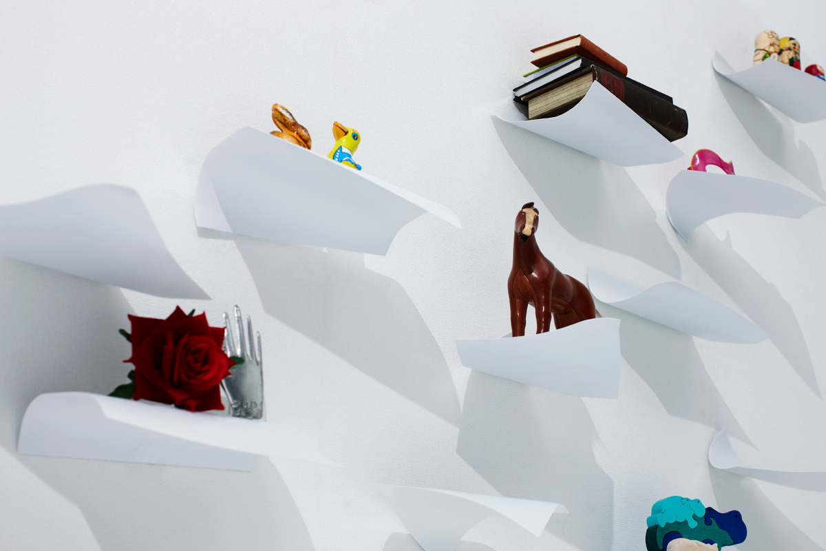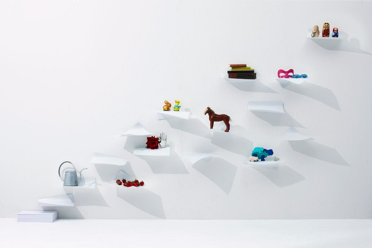 ひらひらと風に揺られ舞い上がる紙のような壁掛け棚があります。