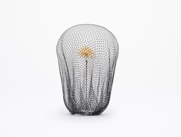 こちらは農作業用のネットを、本来の花瓶のように表現したもの。今まさに花が開かんばかりの印象を強く持ちます。